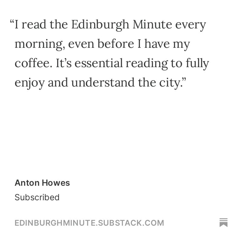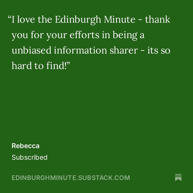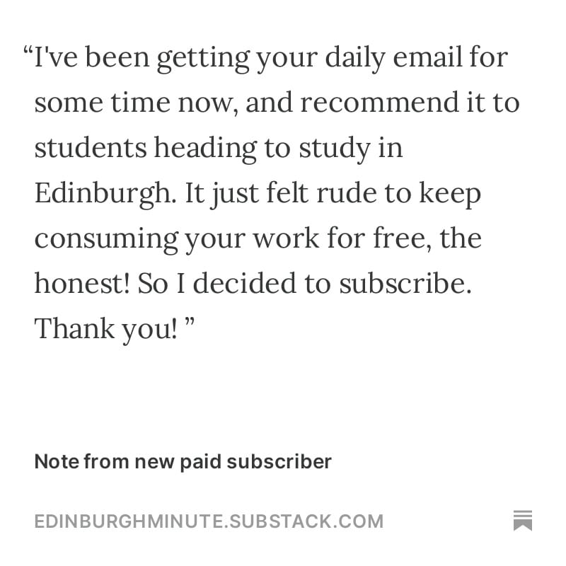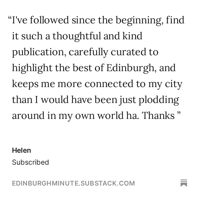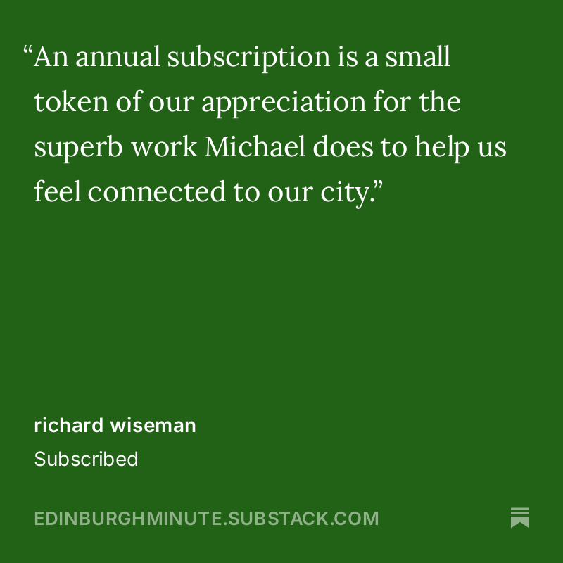 But the truth is, the Minute wouldn't happen without the kind people who currently pay for their subscriptions. I pay a chunk of that income on hosting fees and admin. Substack costs me 10% of the income, which I believe is worth it. Unlike other sites, there are no ads here and it’s fiercely and proudly independent from an editorial point of view. No ‘sponsored content’, advertorials or irrelevant stories about other places here. It’s 100% Edinburgh and I don’t plan to change that, as it’s where I call home too.