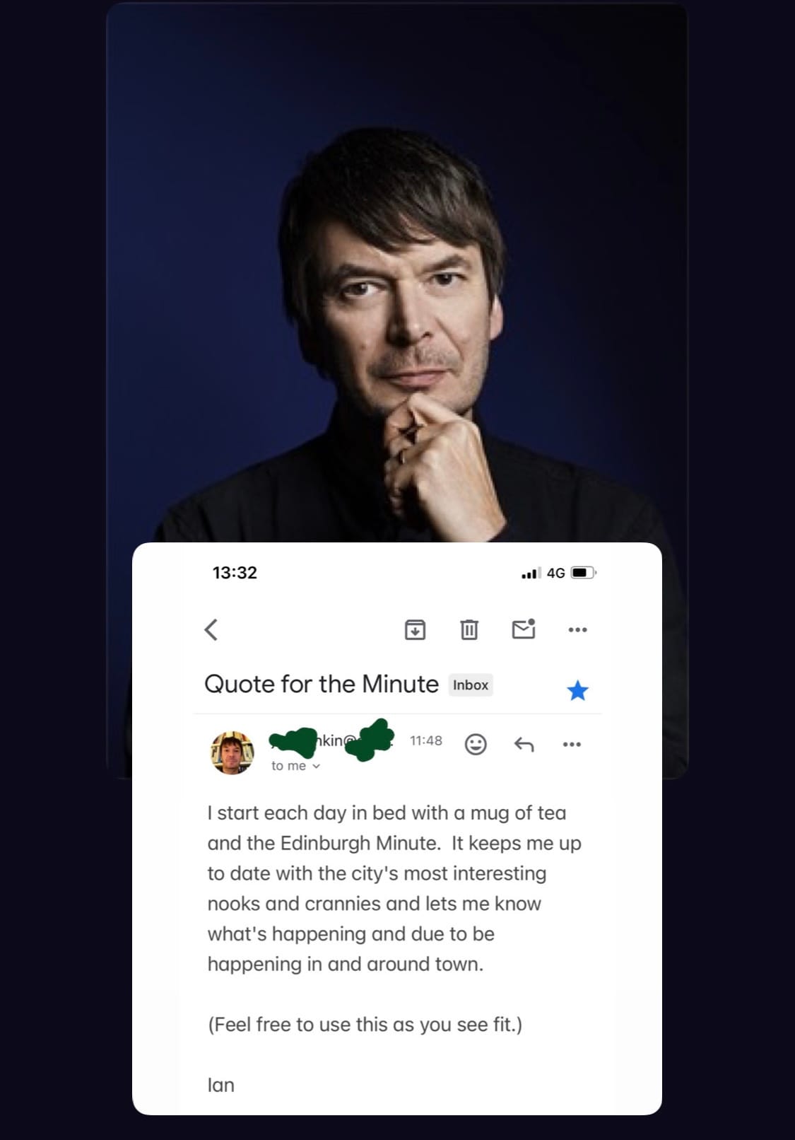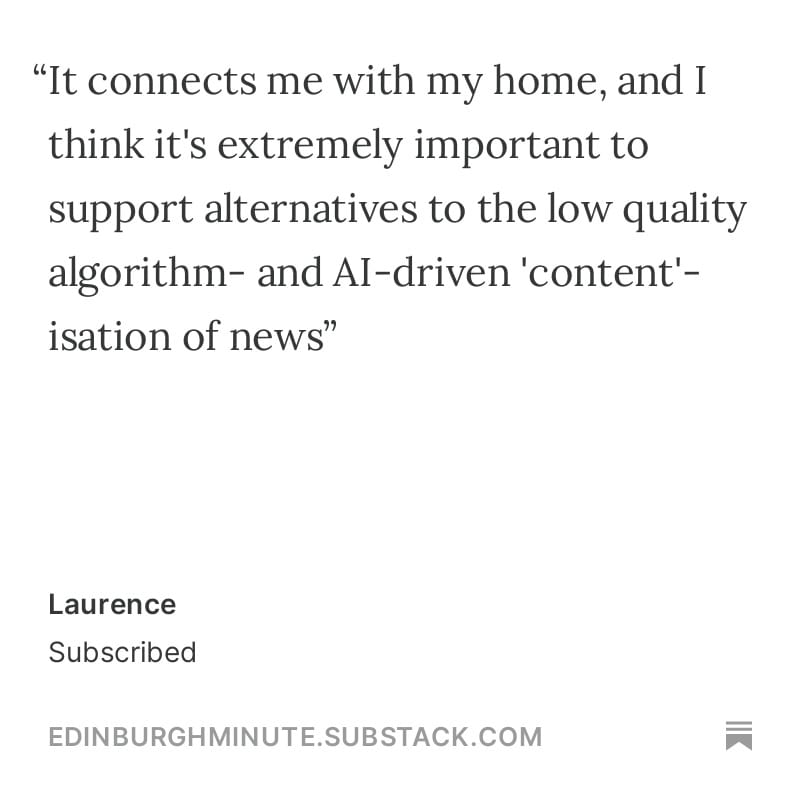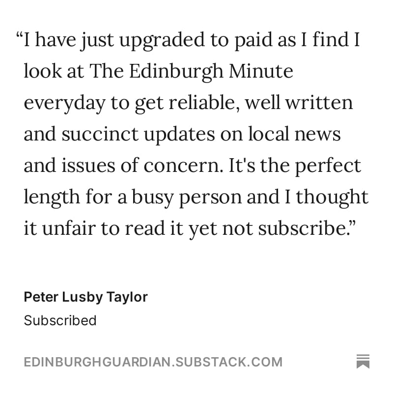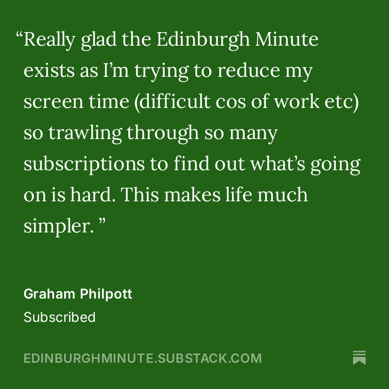 But the truth is, the Minute wouldn't happen without the kind people who currently pay for their subscriptions. I pay a chunk of that income on hosting fees and admin. Substack costs me 10% of the income, which I believe is worth it. Unlike other sites, there are no ads here and it’s fiercely and proudly independent from an editorial point of view. No ‘sponsored content’, advertorials or irrelevant stories about other places here. It’s 100% Edinburgh and I don’t plan to change that, as it’s where I call home too.
