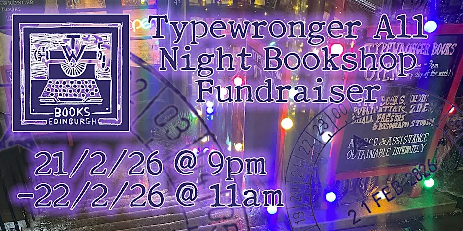 📌 “Indie Leith bookshop Typewronger is pulling an all-nighter to pay their tax bill on Saturday 21st of February! From 9pm to 11am, the shop will remain open and feature a special time stamp for people to prove they were there for it. Come by for a unique browsing experience!” - Thanks to the Typewronger Team for sharing this.