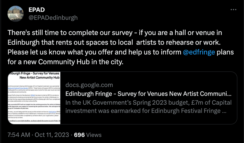 🎭 The Edinburgh Performing Arts Development project has been invited by the Fringe Society to produce a report analysing the existing and potential service provision for artists in Edinburgh. Its goal is ‘to ensure that the new space being developed by EFFS in Edinburgh’s Old Town complements and provides additionality to the city's cultural offer’. - Take part in the survey here. The deadline is Friday 13 October.