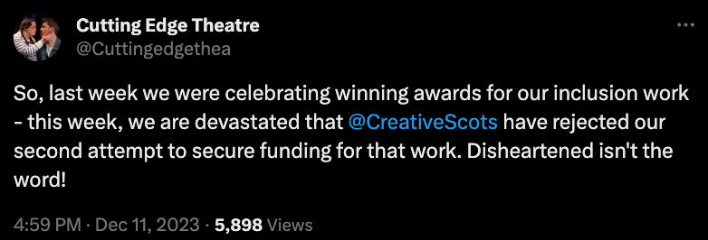 âź More locally, Leith-based Cutting Edge Theatre, founded in 1995 by Suzanne Lofthus, said this week they were âdevastatedâ to have missed out on funding that would keep the organisationâs award-winning work going.