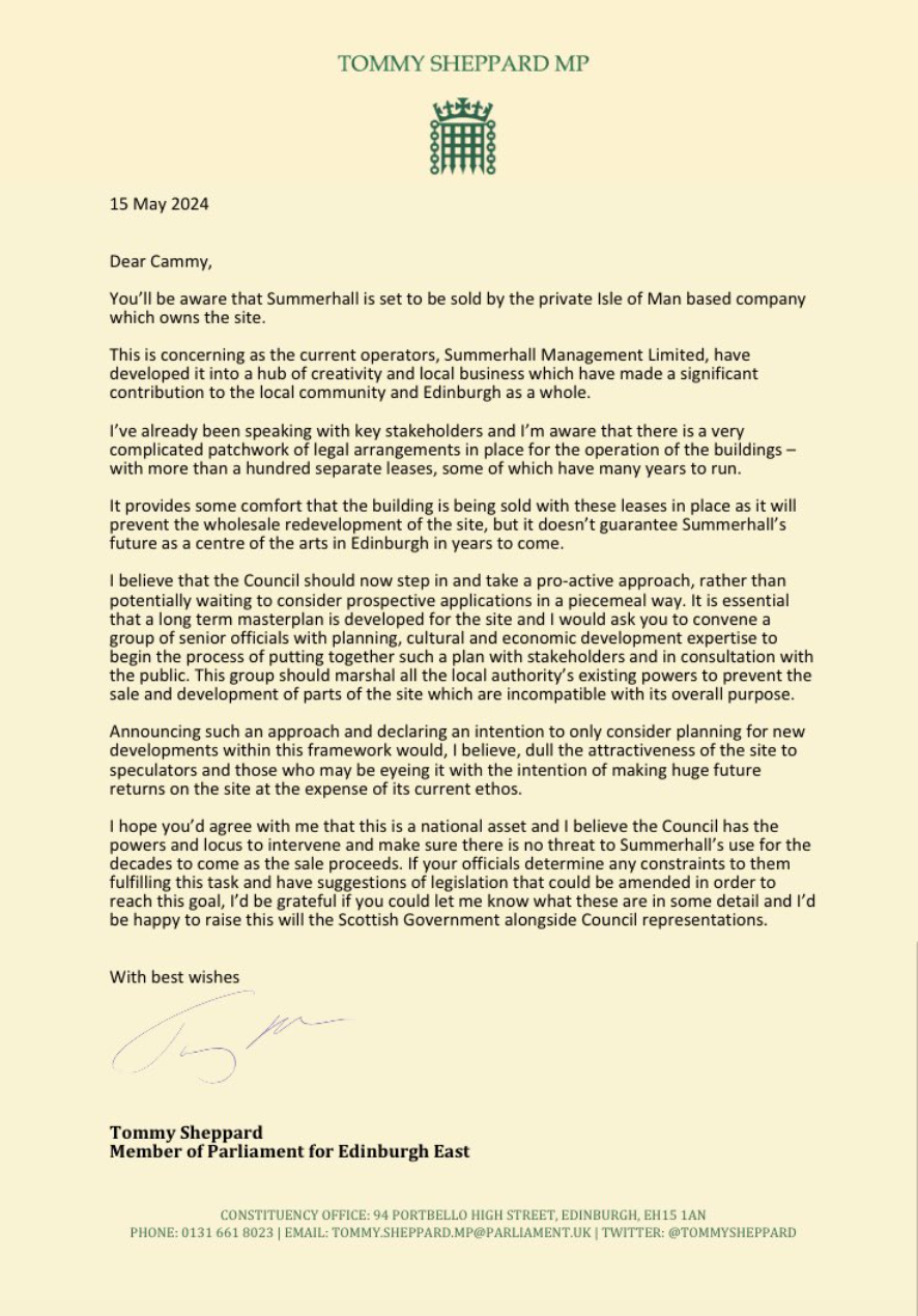 - Edinburgh MP Tommy Sheppard has today written to council leader Cammy Day “asking that the Council use its powers to create a Summerhall masterplan. Working with stakeholders, plans could protect Summerhall as a hub of the arts in Edinburgh through any sale of the site & for decades to come.” Here’s his letter: