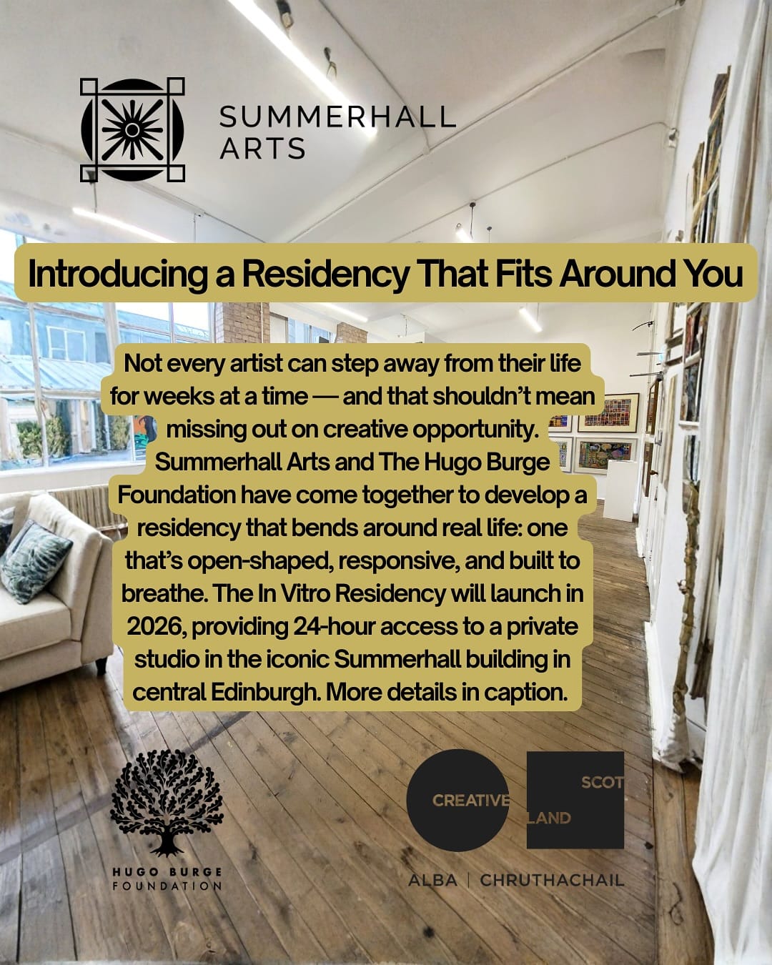 🎨 Summerhall Arts has announced a new residency programme aimed at people living in Edinburgh. The In Vitro Residency will launch next year in partnership with the Hugo Burge Foundation. It includes a £1,200 stipend, 24-hour access to your own studio, the opportunity to exhibit and curatorial support, installation and technical assistance. - More details are here.