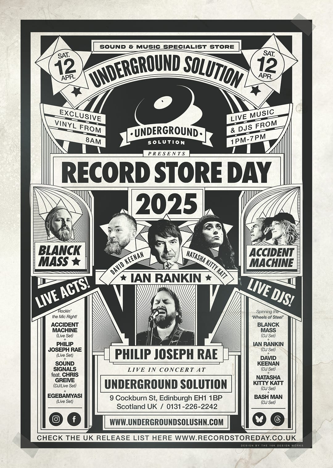 📌 “RECORD STORE DAY at UNDERGROUND SOLUTION - Record Store Day is back on Saturday 12th April and we'll be proudly presenting a mountain of exclusive vinyl releases plus a rather special selection of in-store performances celebrating some of the amazing artists we sell here in the shop. As always, we'll have all 400+ exclusive RSD releases on sale from 8am in the shop with live sets and DJ's including Ian Rankin, Blanck Mass, David Keenan, Philip Joseph Rae, Accident Machine and more. We hope you can join us for this worldwide celebration of Record Shop culture and all the good folk that make 'em special...music lovers unite!” - Thanks to the shop for sharing this.