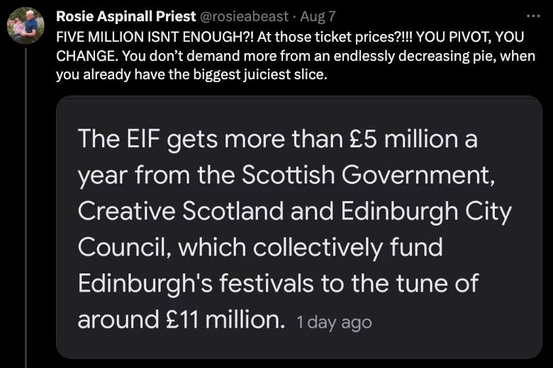 💰 Sticking with the money theme, debate is raging about funding for festivals and the arts in general. There’s a long discussion examining multiple viewpoints in this Twitter thread, featuring artist and researcher Rosie Aspinall Priest, creative Morvern Cunningham and The Scotsman’s Brian Ferguson. Here’s a summary: