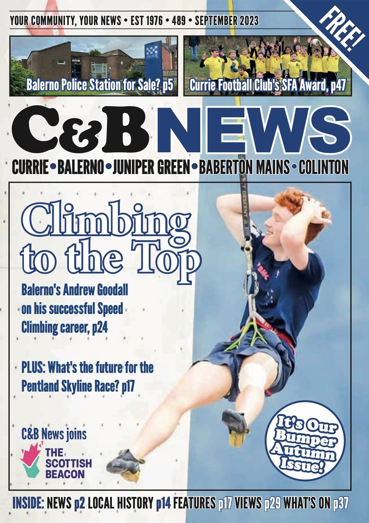 📰 Thanks to C&B News editor Paul Fisher Cockburn for sharing these details of the next free edition: “The September issue of volunteer-led community magazine C&B News is now available online and – from this coming weekend – free from selected outlets in Currie, Balerno, Juniper Green, Baberton Mains, and Colinton. Features include an interview with young speed climber Andrew Goodall, comment from both sides of the Pentland Skyline Race dispute, and ramblers’ sunny and wet summer memories. Plus: local history; local group updates; comment from local politicians and community councils; and the latest local arts and sports news.”