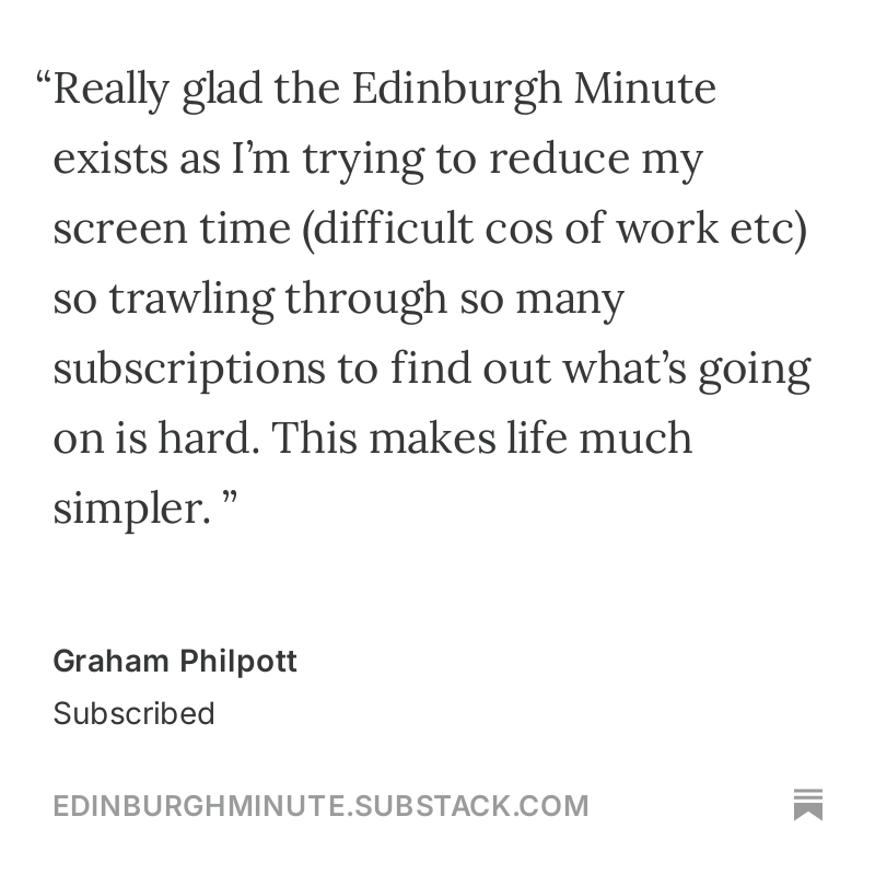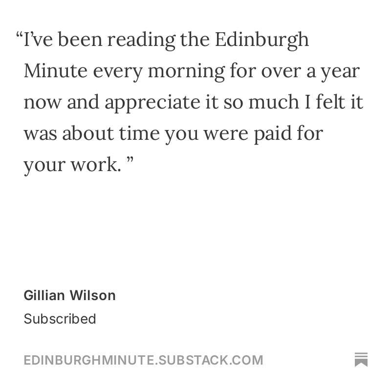 ❄️ Good morning Edinburgh. Sunshine and more freezing conditions are forecast on Friday and Saturday, while Sunday’s due to be slightly warmer and cloudier according to the Met Office. Here’s Friday’s Edinburgh Minute followed by the weekend guide for paying subscribers.