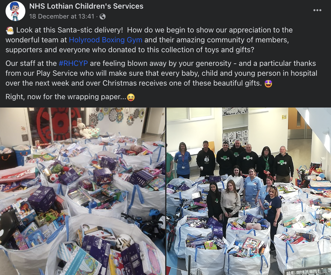 🥊 The Craigmillar boxing gym founded by Trainspotting actor Bradley Welsh closed last week. As a parting gift to the community, the team and volunteers led a toy donation drive over the past two months. This week they delivered thousands of toys to Edinburgh’s Royal Hospital for Children & Young People.