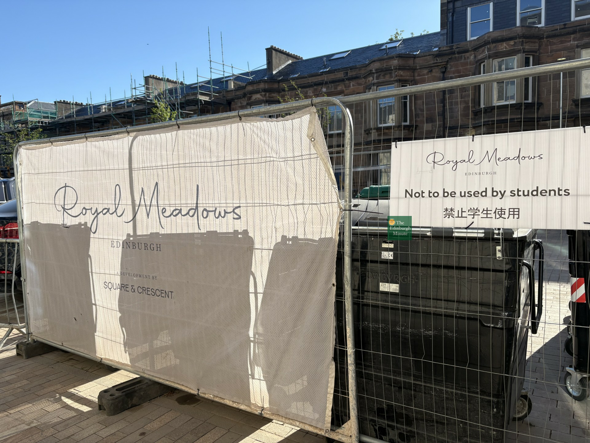 🗑️ A ‘racist’ sign outside student flats in Sciennes has been taken down after residents claimed a developer told them: “You Chinese students are so messy and throw disgusting rubbish at our bins, and us British just need to have a clean environment.” The sign (pictured above) was outside developer Square & Crescent's Royal Meadows property, opposite The Mont iQ student accommodation. A group of 17 residents in Millerfield Place signed an open letter to Square & Crescent, also cc’ing in their MSP, the Chinese Embassy and The Edinburgh Minute. They said: