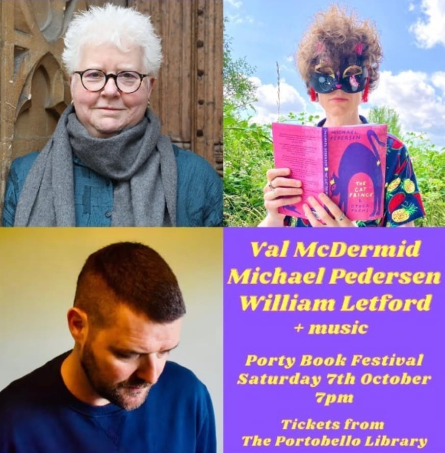 ⮑ Saturday evening’s main event includes Val McDermid, Michael Pedersen and Billy Letford.