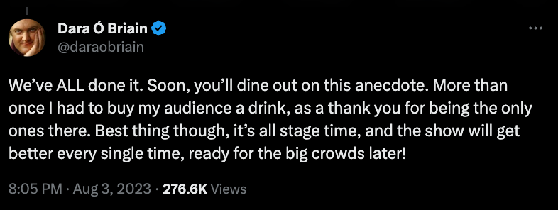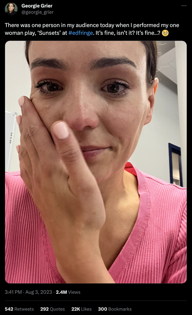 💓 Locals, celebrities and the Fringe community rallied to show support for an actor after she posted online to say only one person had attended her show. Actor and writer Georgie Grier said: “There was one person in my audience today when I performed my one woman play, ‘Sunsets’ at #edfringe. It’s fine, isn’t it? It’s fine…?”