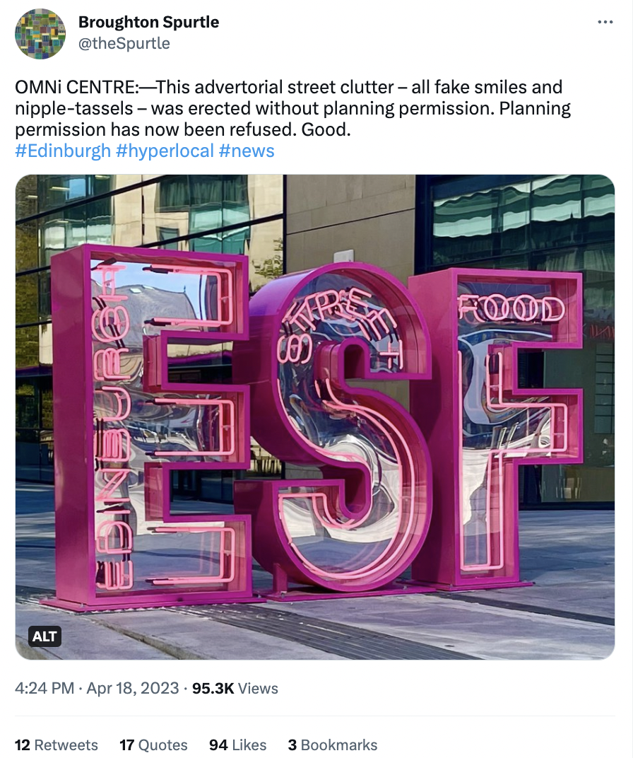 🏗 The 1.5m x 2.7m sign was installed on the Greenside Place / Leith Street site last month, before a planning decision had been made. It cost ESF ‘around £20,000’ but now faces the axe after council planners cited safety fears, calling it an “unacceptable intrusion into the streetscape, which would result in the advertisement creating visual clutter, to the detriment of amenity in the New Town World Heritage site.”