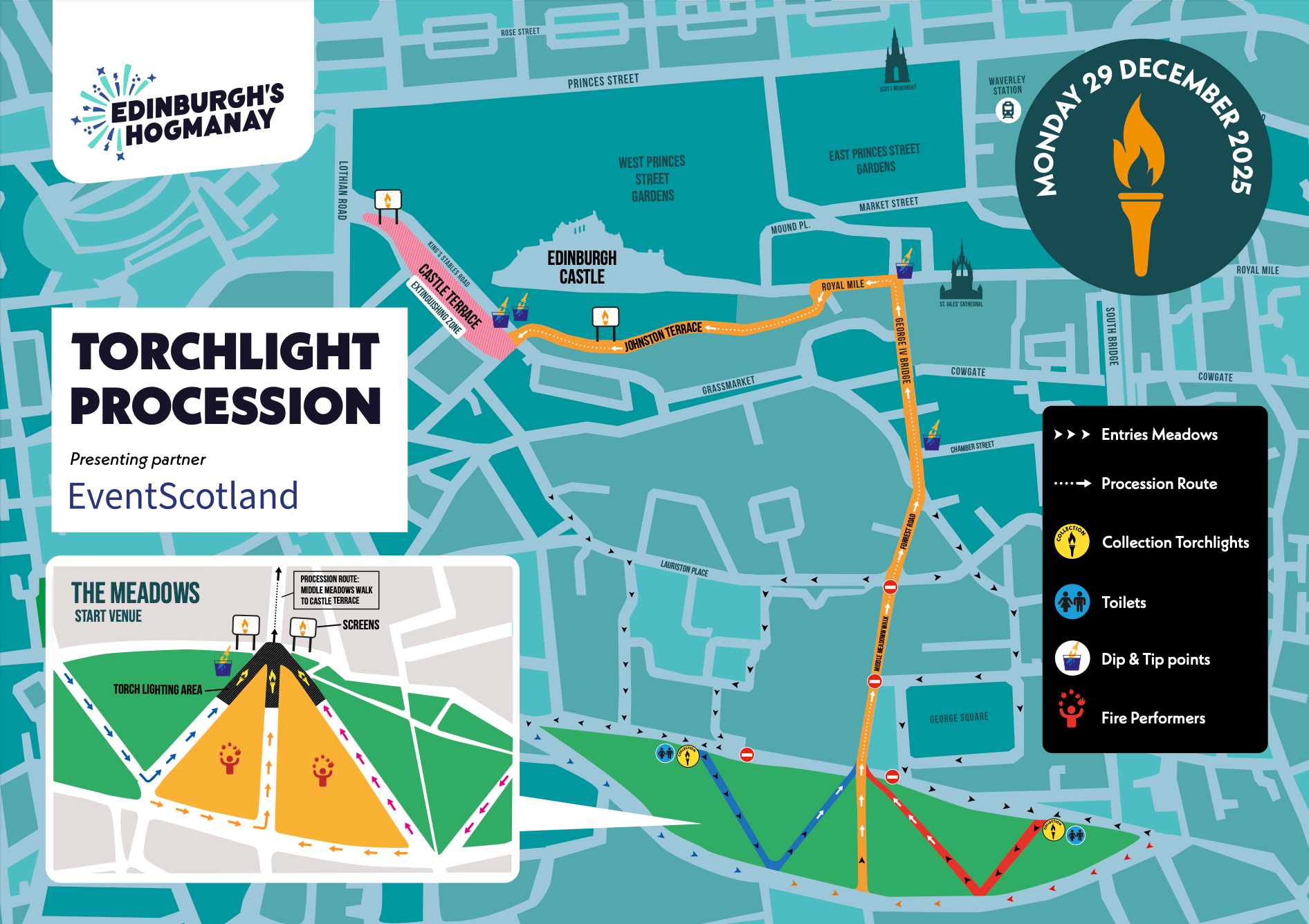 🔥 Torchlight Procession. When: 6pm - 8.30pm, Monday 29 December. Where: Starting in the Meadows then down Johnston Terrace. What: The Torchlight Procession will welcome over 15,000 torch bearers and friends from around the world to once again illuminate the capital’s historic Old Town led by the Massed Pipes & Drums and Vikings from Shetland’s South Mainland Up Helly Aa’ Jarl Squad. - Tickets from £18 here.