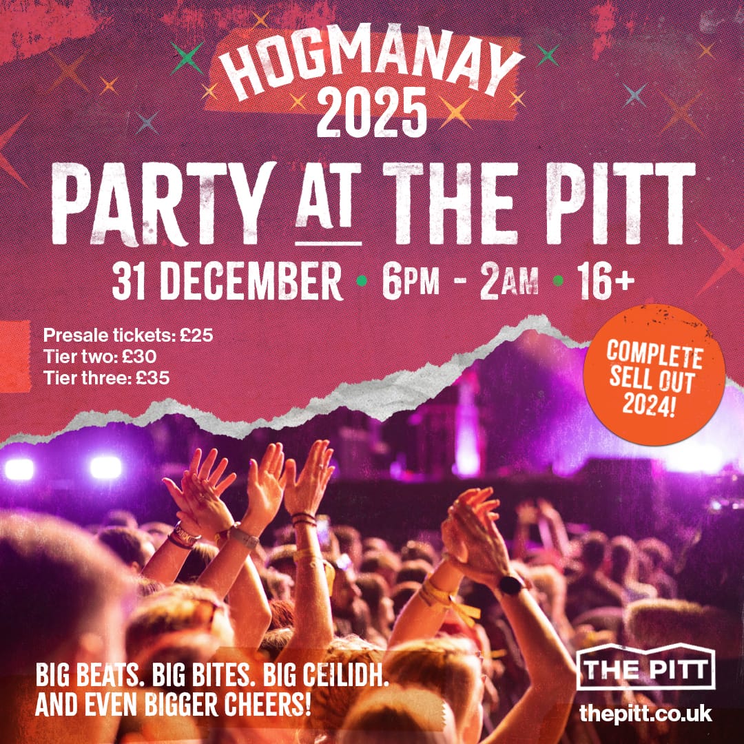 🎉 Hogmanay at The Pitt in Granton sold out last year and organisers tell me it's nearly sold out again. Performing: Auntie Flo, Callum Easter, Fish on Stilts, Juniper Function Band + BOXNRG. They say: "Big Beats. Big Bites. Big Ceilidh. Even Bigger Cheers! Ring in the New Year the Pitt way! Join us for an epic Hogmanay celebration packed with street food feasts, incredible live music, ceilidh dancing, and a countdown to remember." Every ticket includes a complimentary dram at midnight to toast the New Year.