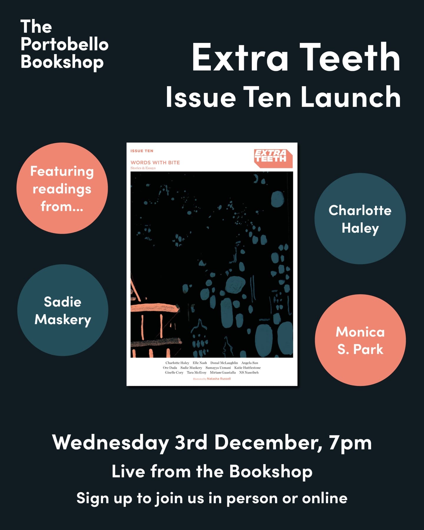 📌 "Wednesday 3rd December (7pm) - Join us at The Portobello Bookshop for the launch of Extra Teeth Issue Ten with readings from contributors to the magazine Charlotte Haley, Sadie Maskery and Monica S. Park!" - Thanks to The Portobello Bookshop for sharing this.
