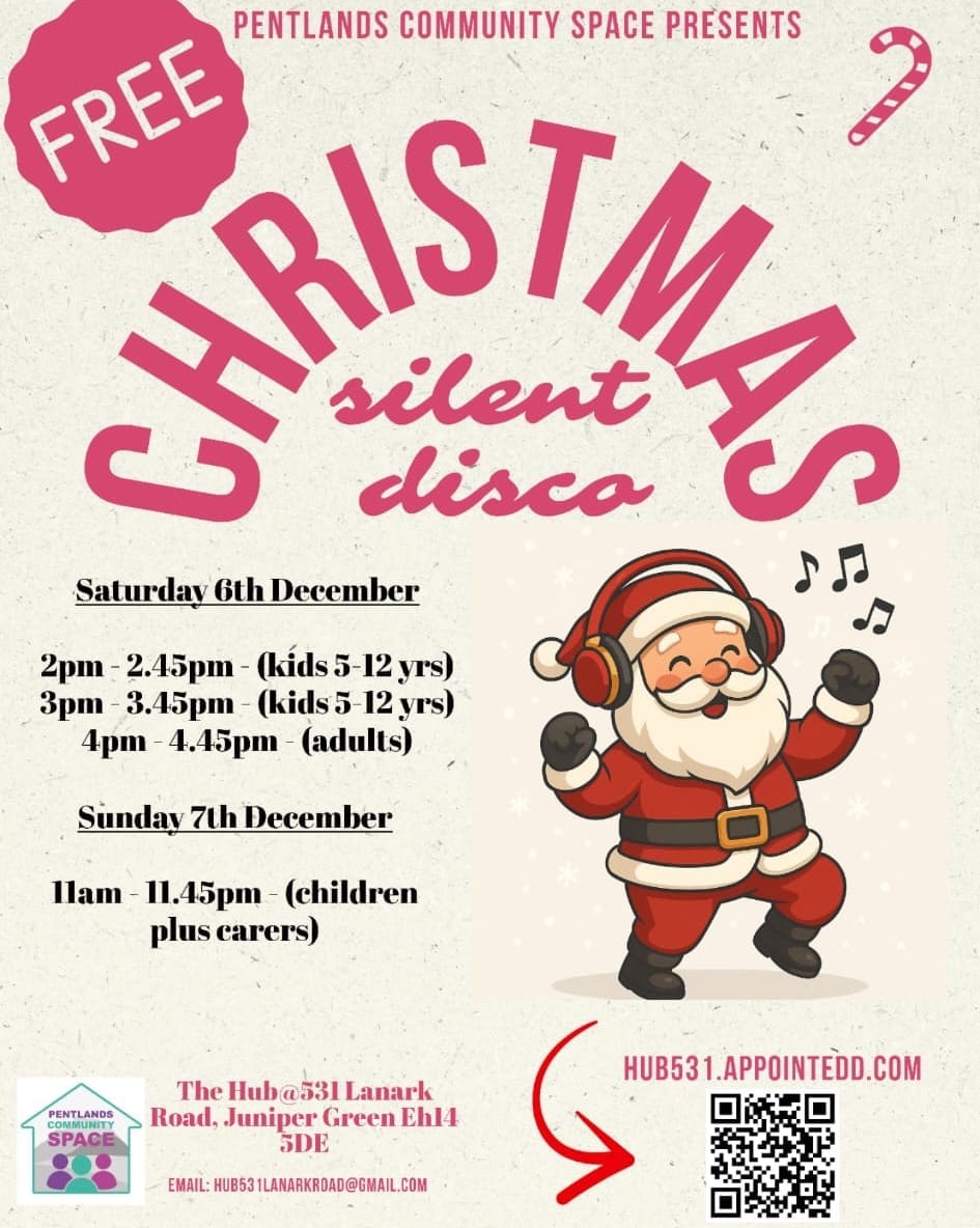 📌 "SATURDAY 6 December - The Hub@531 in Juniper Green will be throwing a free children's Christmas silent disco. Open to locals, visitors and those who just like to boogie! There is a session at 11am on Sunday for children who prefer a quieter session, just book using the link." - Thanks to Colin Macleod, Pentlands Community Space Trustee, for sharing this.