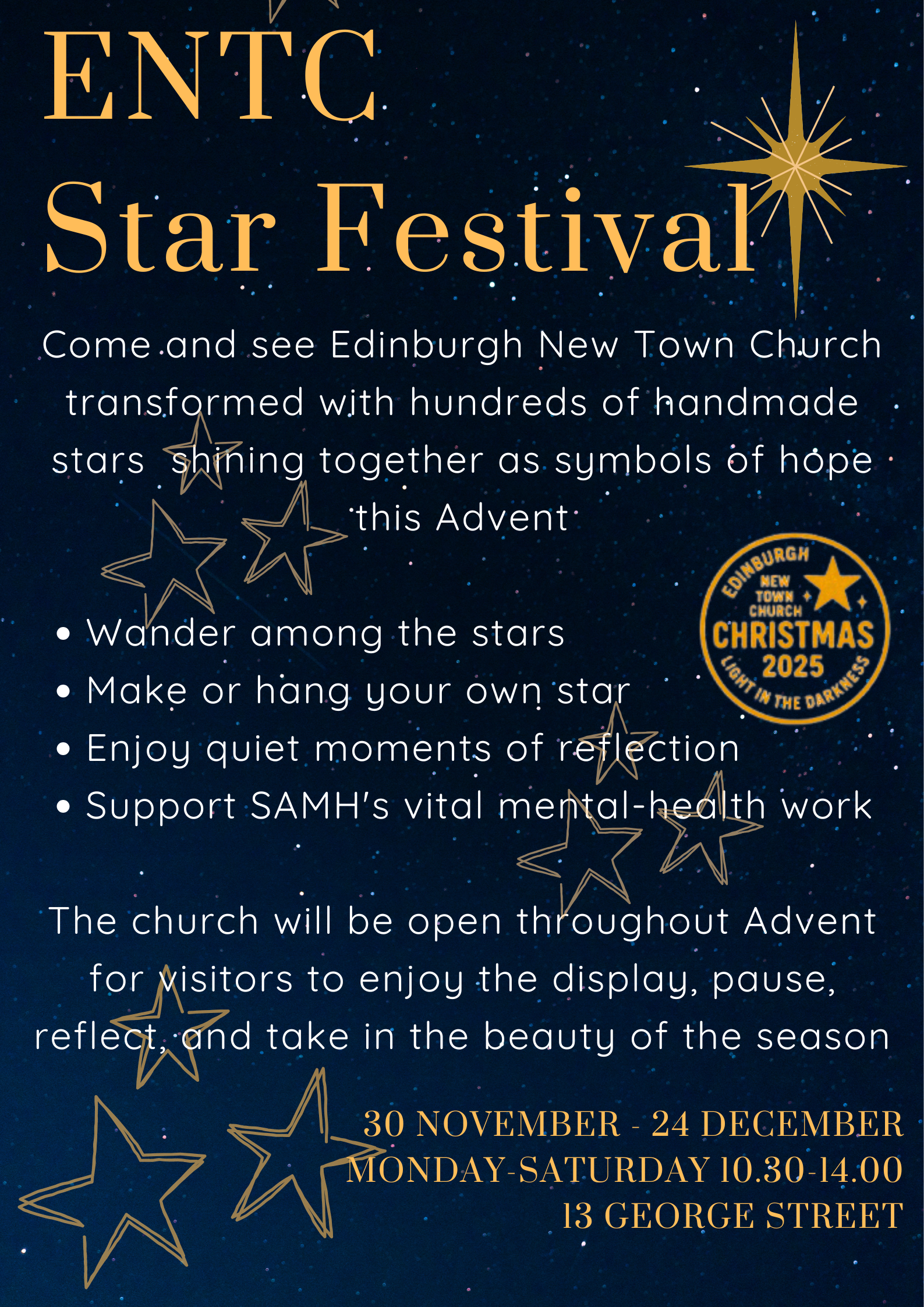 📌 "The New Town Church, 13 George St is hosting a Star Festival through advent. Drop in Monday - Saturday between 10am and 2.30pm On 9th and 16th December SAMH will be holding TIME FOR ME drop in sessions." - Thanks to Julia Forsyth at The New Town Church for sharing this.