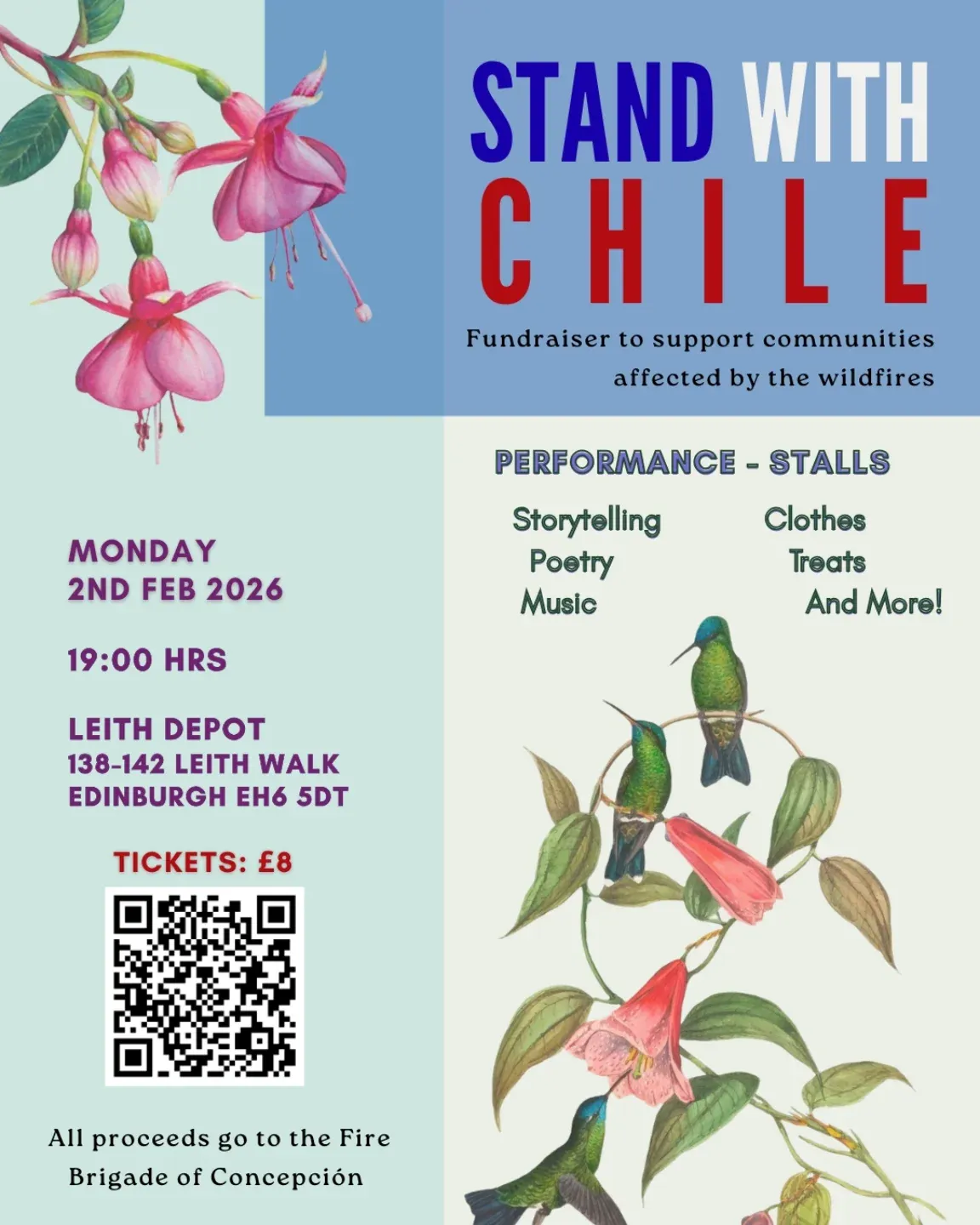 📌 “Monday 02 February, 19:00 Stand in solidarity with Chile at Leith Depot! Come enjoy music, spoken word, and stalls to help the Fire Brigade fight the Wildfires in the south. Tickets £8 at the door, includes tea and Cake.” - Thanks to Tere Bertucci (Organiser) for sharing this.