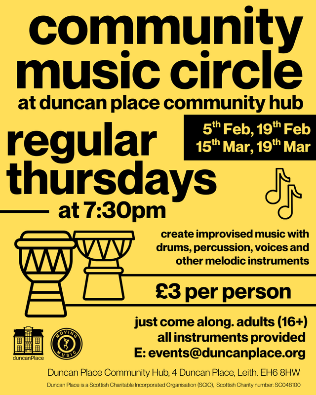 📌 “Thursday 5th February - Come and join our Music Circle at Duncan Place Community Hub! Meeting regularly at 7:30pm, we play with percussion, voice, and improvisation to make music together in a relaxed environment. Beginners and all experience levels very welcome, £3 per session.” - Thanks to Ot from Duncan Place Community Hub for sharing this.