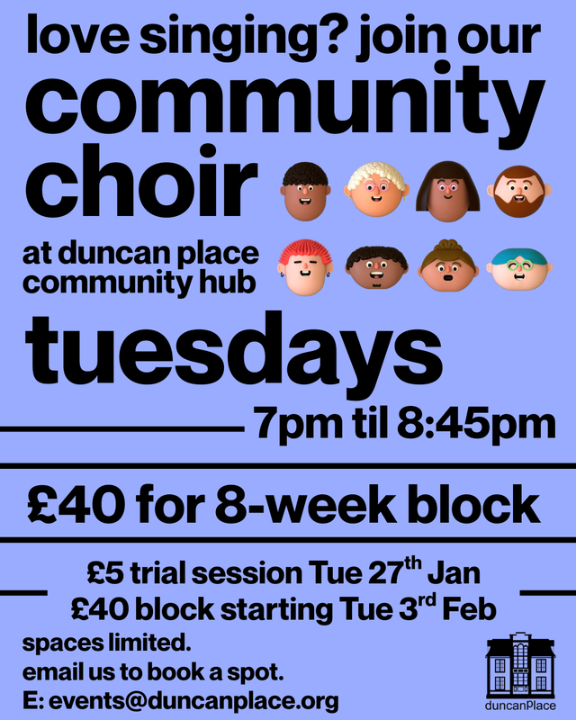 📌 “🎶 If you live in or around Leith and love singing, we've a few spaces in our community choir. We've got a £5 trial session this Tuesday 27th January, 7pm-8:45pm before the next 8-week block (£40) starts the following week. Spaces limited - email events@duncanplace.org for more info/to book a spot.” - Thanks to Drew from Duncan Place Community Hub for sharing this.