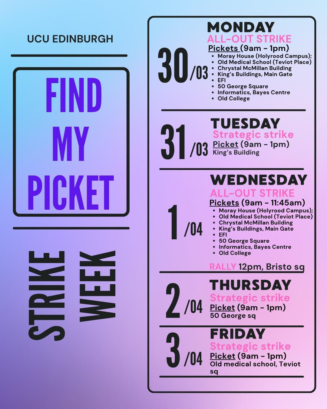 🎓 Some University of Edinburgh staff are due to begin five days of strike action this morning over compulsory redundancy fears. Sophia Woodman, the UCU Edinburgh branch president, said: "Members are clear that management haven't engaged in meaningful consultation and we've no choice but to come back out on strike." Principal Peter Mathieson responded: "While we respect the right to protest, we will do everything we can to protect our students and staff from any disruption." - The union published its plans for this week here, including plans for a joint rally with Herriot-Watt union members on Wednesday at Bristo Square.