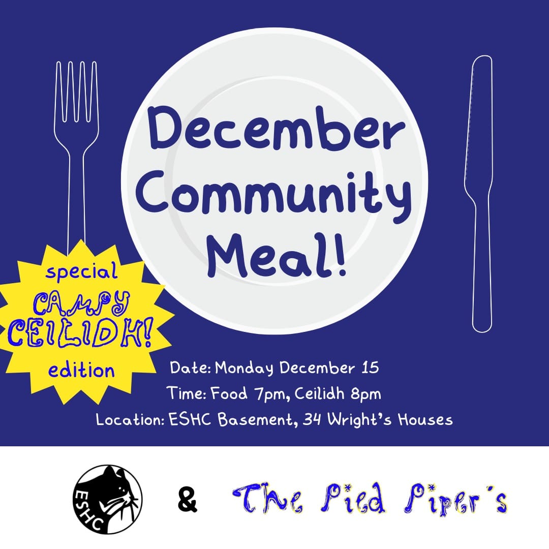 📌 “Join ESHC and Pied Piper Ceilidh Band for a FREE community meal + ceilidh to cap off the year! Date: Monday December 15. Time: Dinner from 7pm, Ceilidh from 8pm. Location: ESHC basement, 34 Wright’s Houses.” - Thanks to ESHC for sharing this.