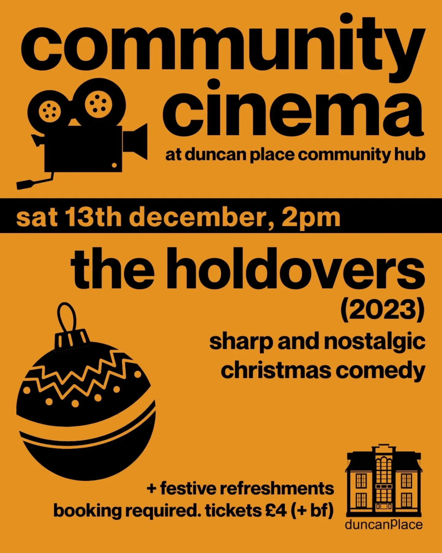 📌 “Saturday 13 December, 2pm - Community Cinema screening of The Holdovers at Duncan Place Community Hub in Leith (festive snacks included!) - Pre-booked tix only (£4+bf) via link.” - Thanks to Drew from Duncan Place Community Hub in Leith for sharing this.