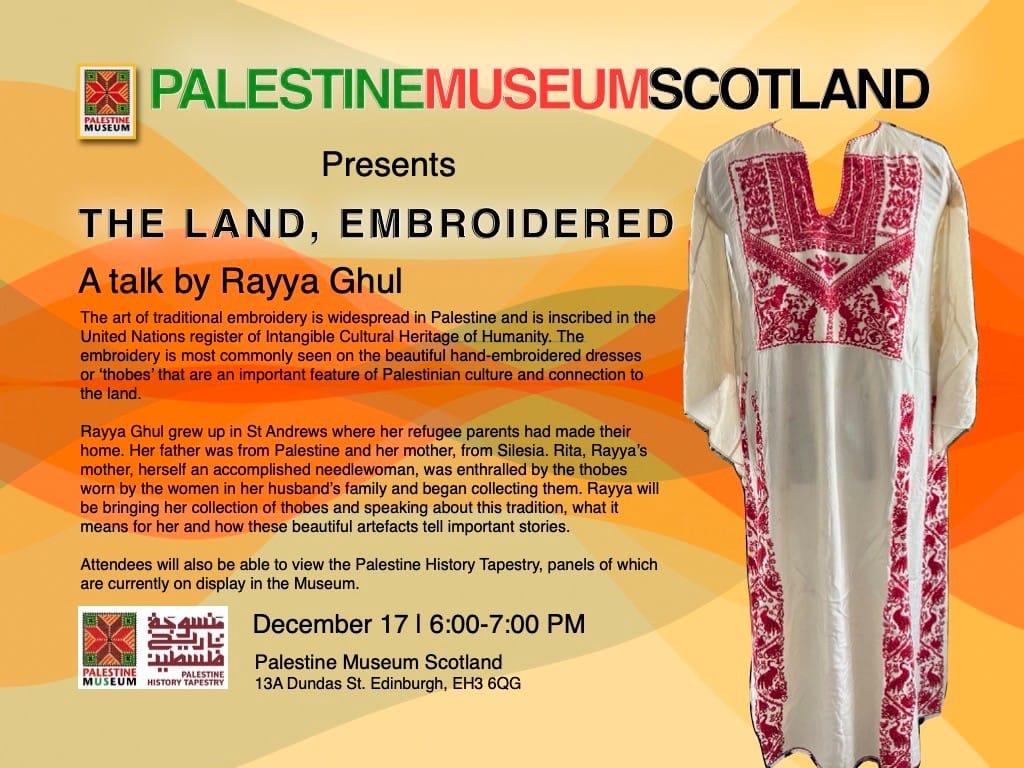 📌 “Wednesday, 17th December 6-7pm. Palestine Museum Scotland, 13a Dundas Street is hosting a talk featuring a display of Palestinian national dresses. Rayya Ghul, a local retired academic, has a collection of dresses from her Palestinian family and will tell her family story through each dress. Free.” - Thanks to Rayya Ghul, Palestine Museum Scotland volunteer, for sharing this.
