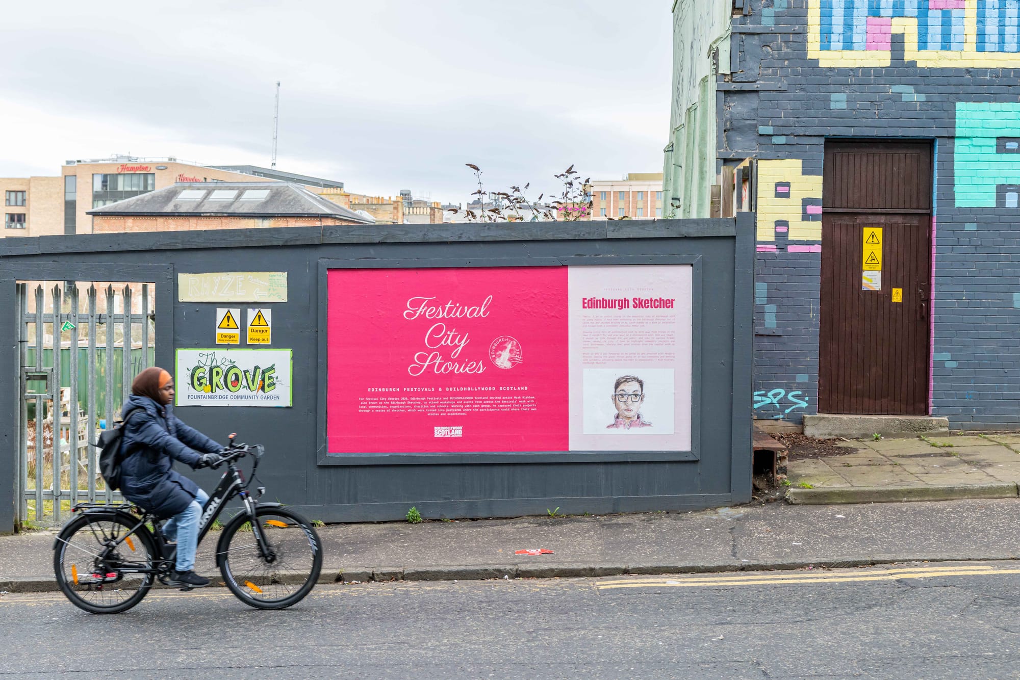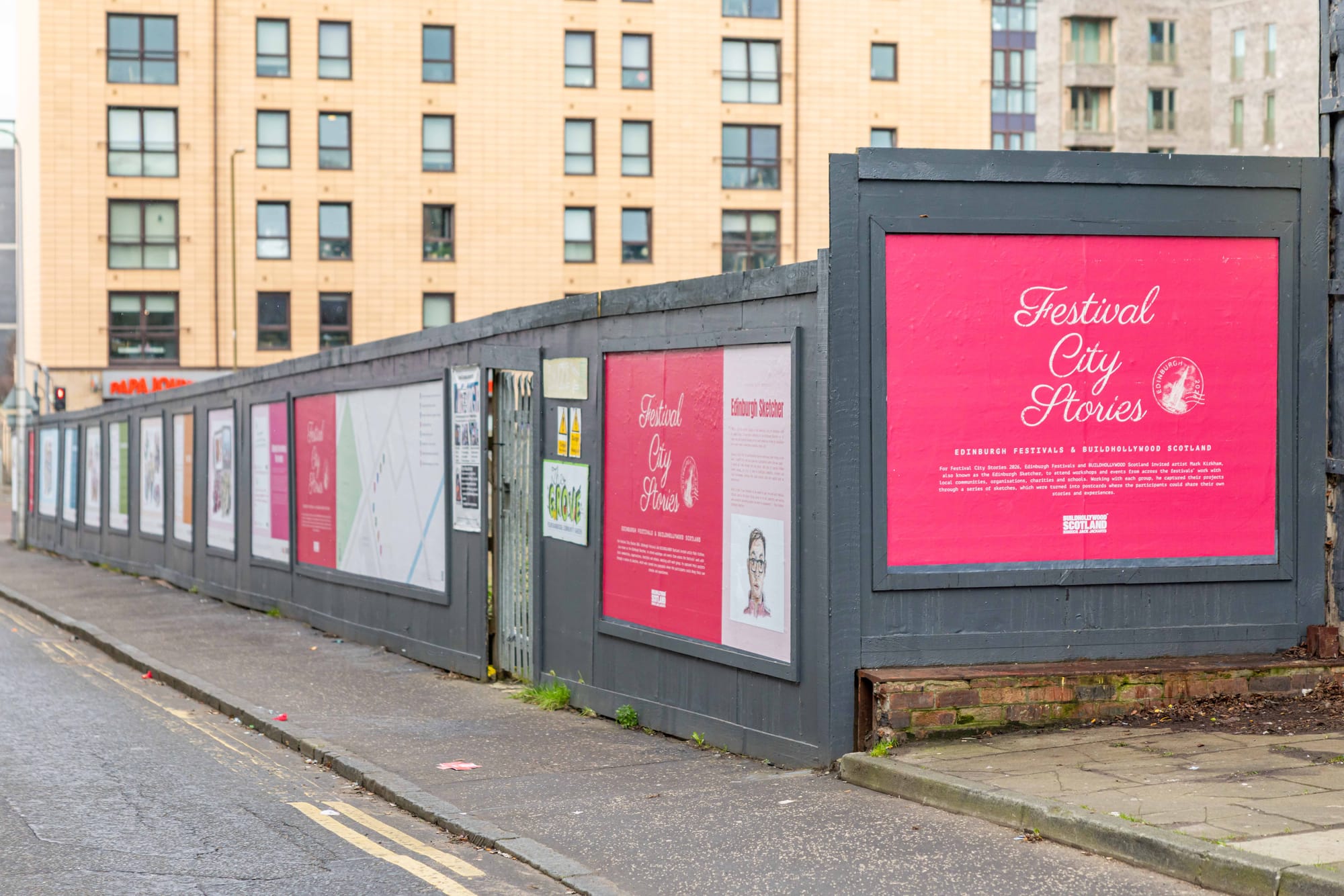 🖼️ Artwork by Mark Kirkham, also known as the Edinburgh Sketcher, has gone on display on hoardings in Dundee Street, Fountainbridge, to celebrate the third year of the Festival City Stories project. The art was unveiled at an event last night at Edinburgh Printmakers, featuring stories and performances from people involved in year-round partnerships between festivals, local community groups and schools. - Find out more about the Edinburgh Festival City Stories and BUILDHOLLYWOOD project here.