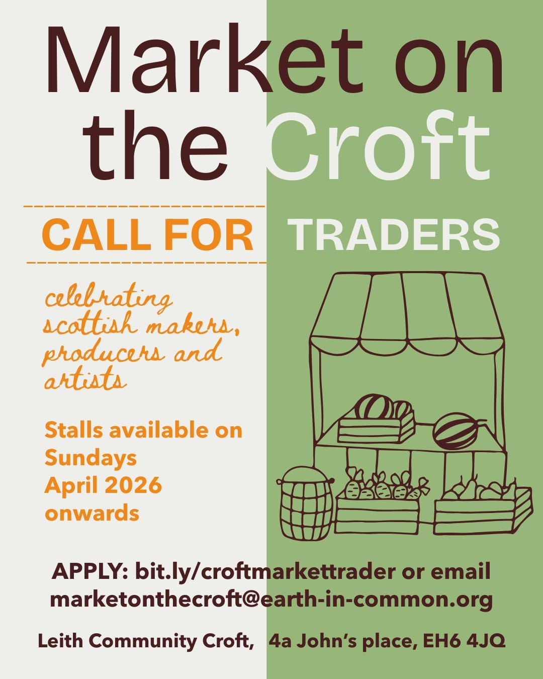🛒 Call for Market Traders- Market on the Croft 10-4pm- April 2026 onwards - 'Market on the Croft want to here from makers, producers, artists, food vendors alike, looking for the opportunity to trade at Leith Community Croft in the coming weeks and months. Apply via the link or email marketonthecroft@earth-in-common.org' - More details here, shared by Earth in Common- Leith Community Croft.