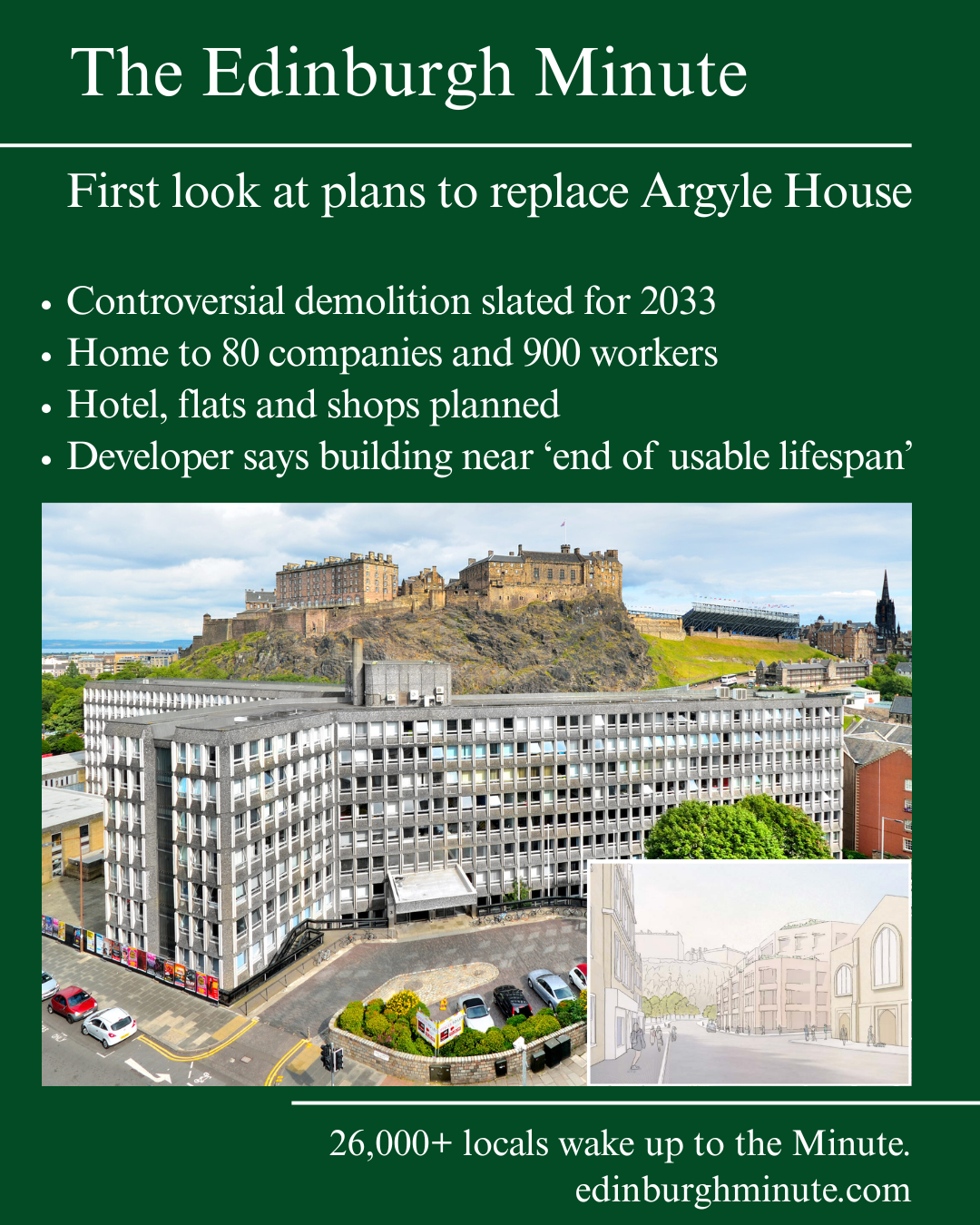 🏗️ Plans for a new hotel and housing in the shadow of Edinburgh Castle have been published as part of a bid to demolish Argyle House. The building is currently home to 80 companies and 900 workers including CodeBase. Developer hendersonherd claims the structure is "coming to the end of its usable lifespan and no longer meets the needs of the modern occupier." Last month CodeBase told the Minute it would remain in the building 'for at least the next year'. The building owner PGIM is leasing the building to Telereal Trillium, in a deal due to end in 2033.