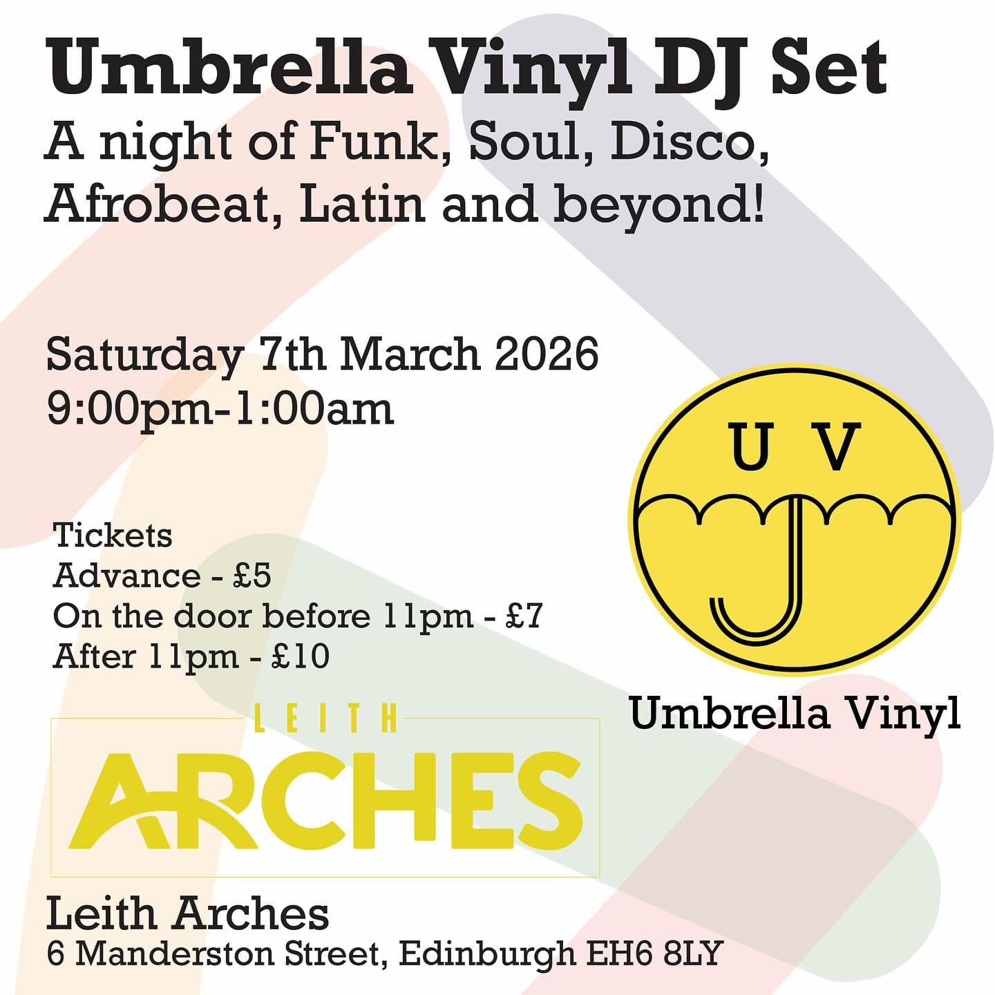 Sat 07 March - Vinyl only night at Leith Arches on Saturday 7th March from 9pm - 1am! Josh, Nick & Laura will be bringing their irresistible blend of international beats to the floor! Afrobeat, funk, soul, disco, latin, Bollywood and beyond! Expect to dance! ☂️🎶