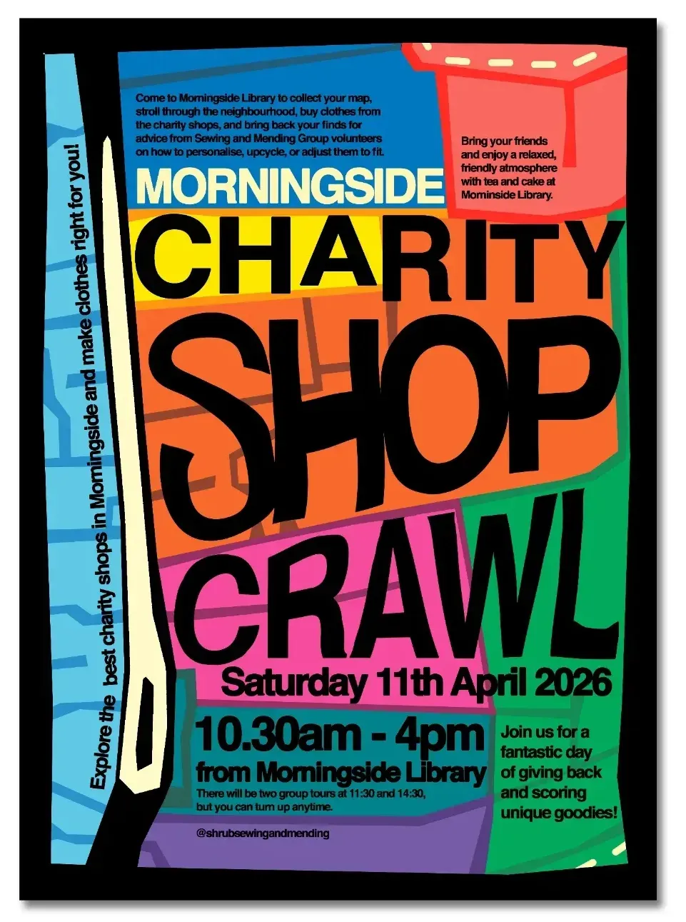 Sat 11 April - 'Come to Morningside Library to collect your map, stroll through the neighbourhood, buy clothes from the charity shops, and bring back your finds for advice on how to personalise, upcycle or adjust them to fit. And there's tea and cake!'