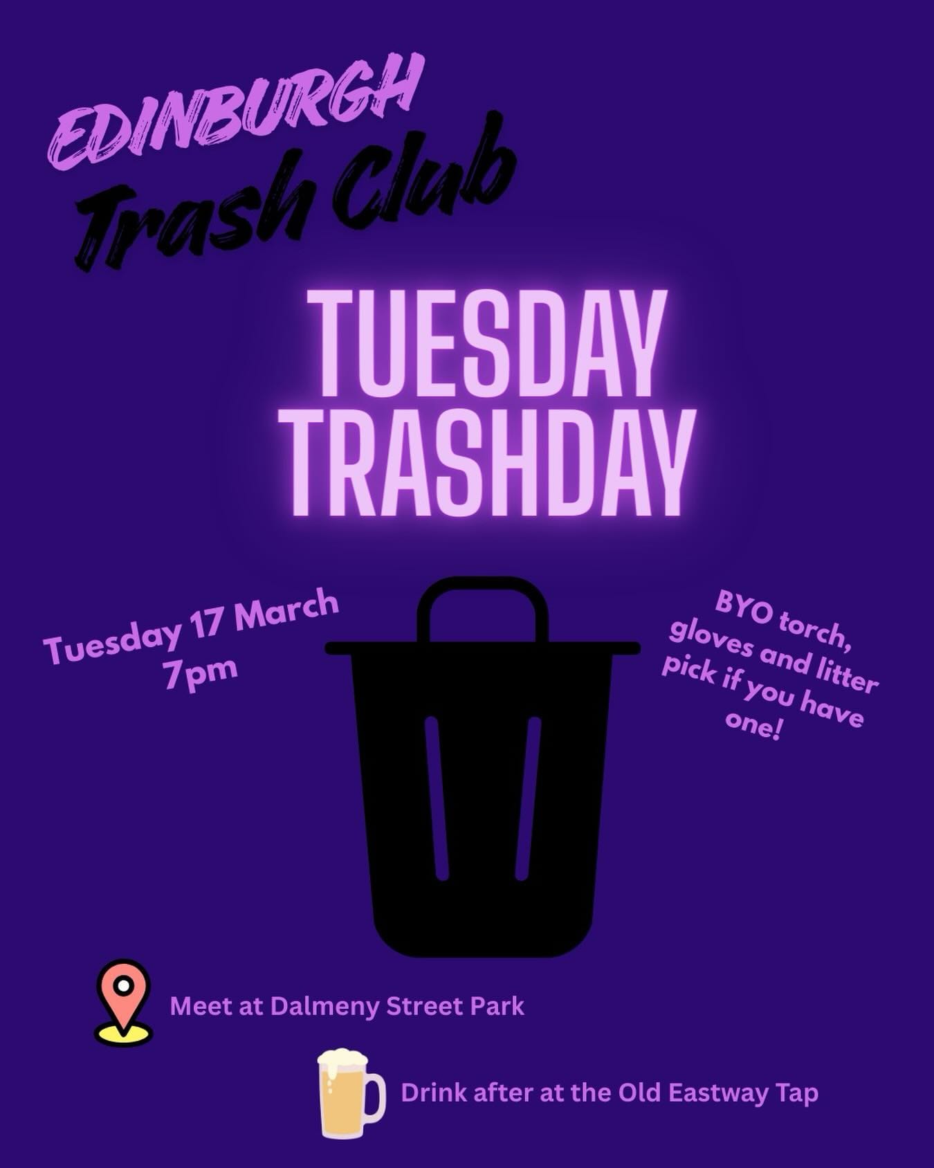 Today, Tue 17 March - 'Join us at 7pm at Dalmeny Street Park for an hour of trash-picking - we provide bags and pickers, but please do bring a headtorch / light and gloves if you have them. Pub after!'