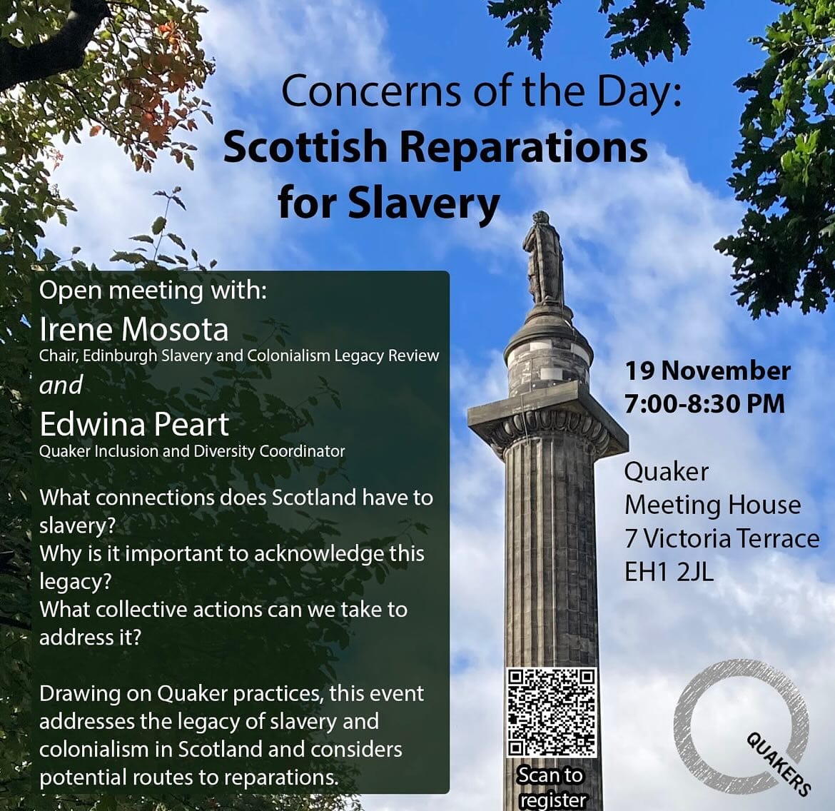 📌 "Wednesday 19 November 7:00-8:30 PM - An open meeting on routes to reparations for slavery. With the input of local experts, and drawing on Quaker practices, we will collectively consider how to address this difficult issue. People of all faiths, and none, are welcome!" - Thanks to Central Edinburgh Quaker Meeting House for sharing this.