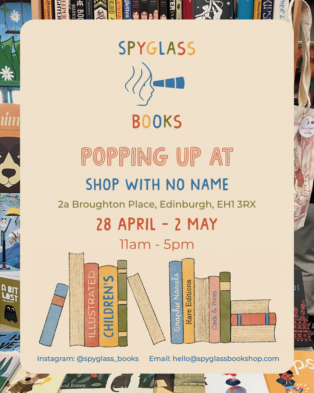Today, Tue 28 April - 'A bookshop for children's and illustrated books will be popping up at Shop With No Name, on 28 Apr - 2 May, 11am-5pm, also featuring Ditto stationery. Spyglass Books will open at a permanent location on Leith Walk later this year.'