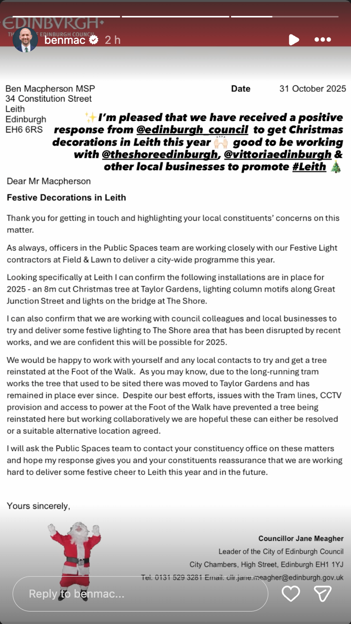 🌟 Also arriving in Leith soon: a Christmas tree. Local MSP Ben Macpherson wrote to the council to make the case. He said:
