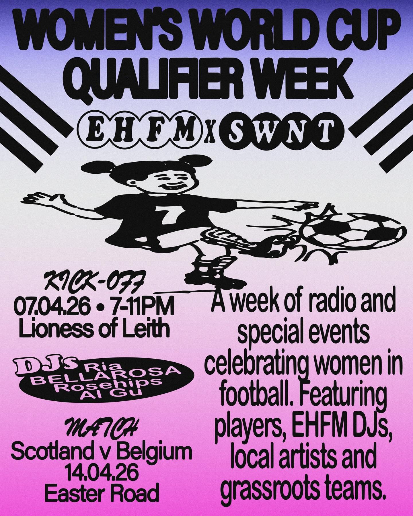 Today, Tue 07 April - 'EHFM is throwing a party to kick off a whole week of celebrations leading up to the FIFA Women's World Cup Qualifier against Belgium at Easter Rd on 14th April. EHFM DJs, great tunes and a celebration of women and their achievements! Entry is FREE.'