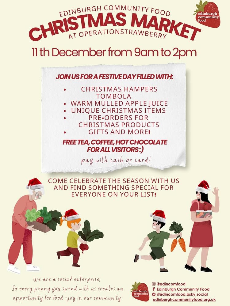 📌 “Thursday 11th December from 9am - 2pm: Edinburgh Community Food Christmas Market at 22 Tennent Street, Edinburgh, EH6 5ND. Join us on at OperationStrawberry for a festive day filled with Christmas hampers, warm mulled apple juice, unique gifts, tombola, and more!” - Thanks to Tilly for sharing this.
