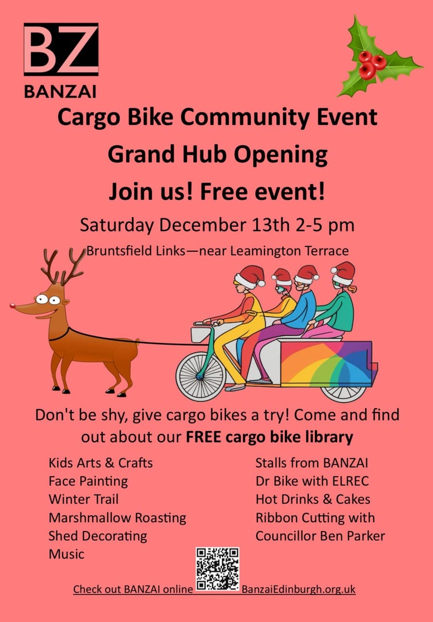 📌 “Sat 13th, 2-5pm. Free family-friendly community cargo bike event at the new Hub, on The Links, corner of Bruntsfield Place & Bruntsfield Terrace: refreshments, music, face- & shed-painting, winter trail & free health-check for your bike. Give cargo bikes a try! Discover the FREE e-cargo bike library.” - Thanks to Mick Patrick, from BANZAI Bikes (a project of Bruntsfield Area Net Zero Action Initiative), for sharing this.