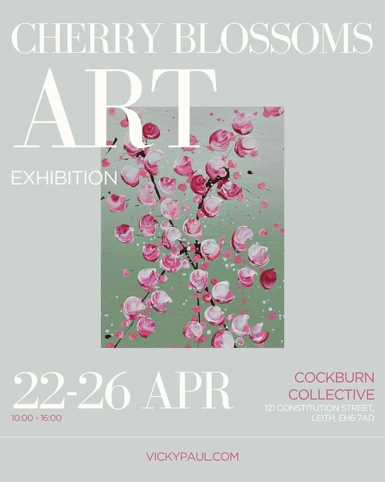 - ⮑ Local artist Vicky Paul will exhibit her own cherry blossom paintings at the Cockburn Collective, 161 Constitution Street, opening from 22 April. - More details here from the artist studios.