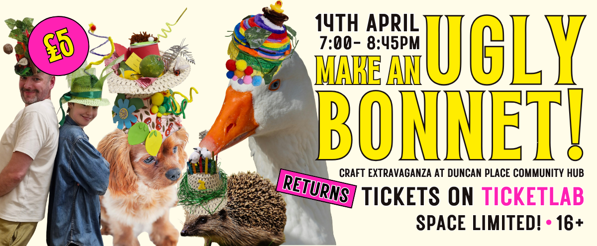 Tue 14 April - 'Have you ever wanted to make your own ugly bonnet?? Come and craft your dream ridiculous hat on Tue 14th April, 7pm at Duncan Place Community Hub. All materials provided - just bring along a willingness to be silly! Self led session, for adults 16+.'