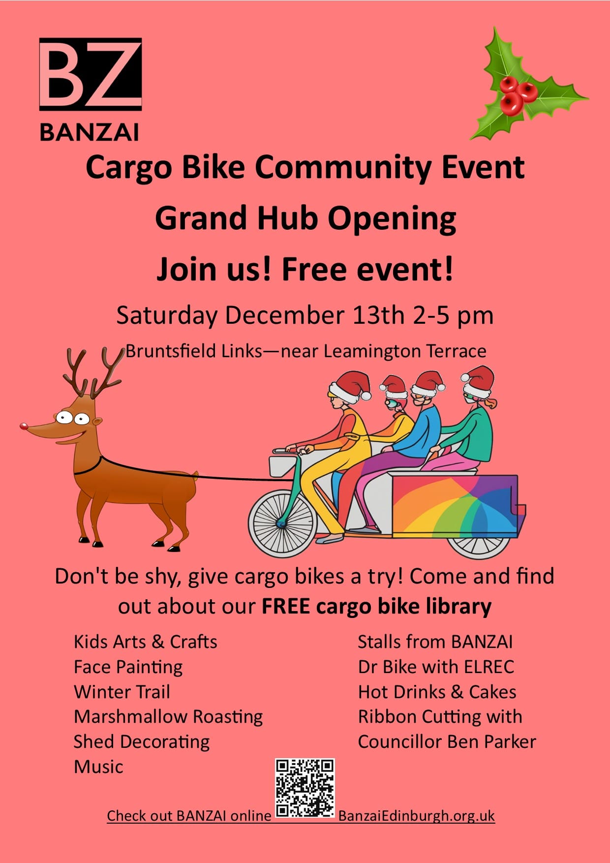📌 “Sat 13 December, 2pm-5pm: Grand Opening of the BANZAI (Bruntsfield Area Net Zero Action Initiative) Cargo Bike Library hub on Bruntsfield Links near Leamington Tce. Join us for family fun, face painting, Winter Trail, free Dr Bike with ELREC, hot drinks, cakes, live music and cargo bike rides!” - Thanks to Carol from BANZAI Bikes for sharing this.