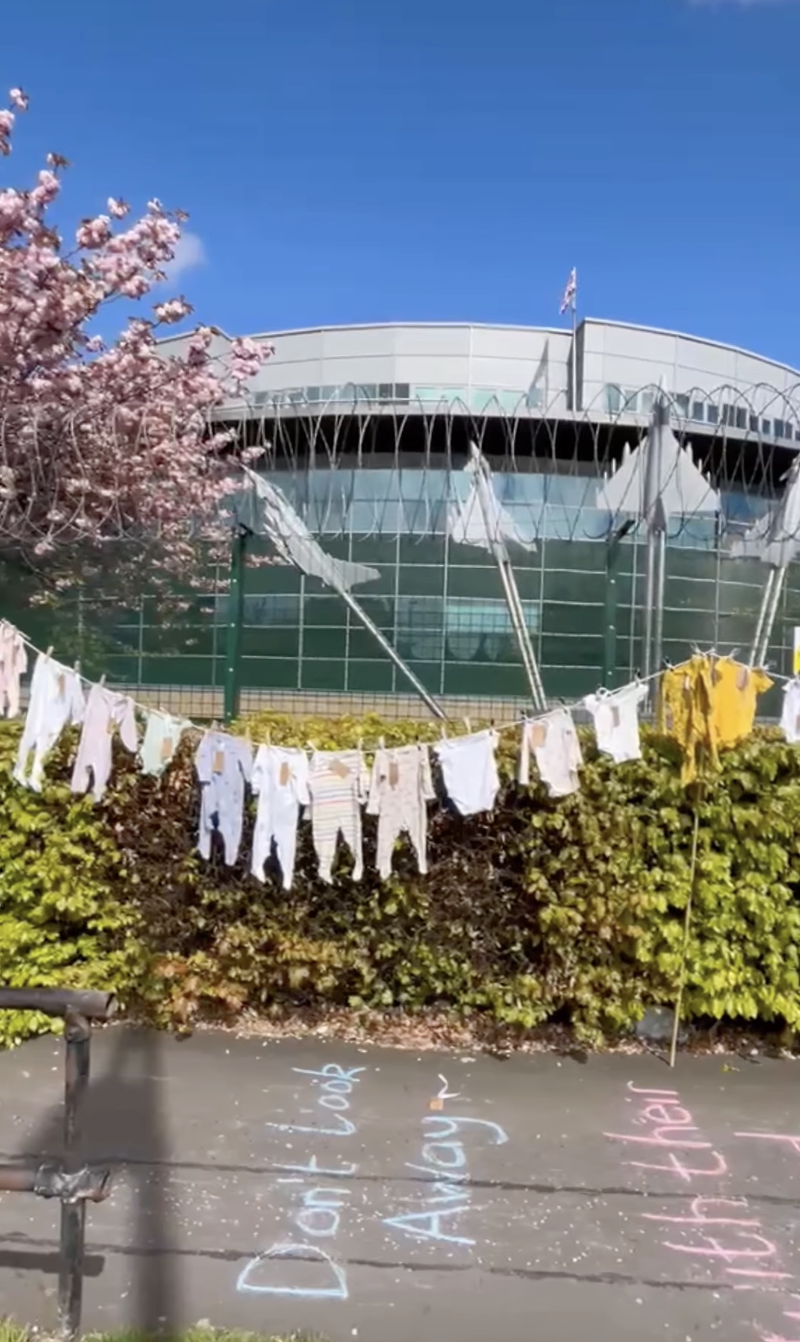 - The Mothers Against Genocide Scotland group hung a washing line of children's clothes outside the factory. They shared a video from the protest here.