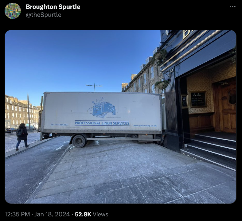 ⛔️ For the third time in a month, another vehicle got stuck on the stair at the top of Greenside Lane yesterday after driving over the cycle lane and pavement. This time it was a lorry. Local councillor Finlay McFarlane said he had flagged the problem to the council last year and is worried ‘someone is going to get hurt’. He told me last night that a temporary barrier will be put across the road and that while Google Maps is fixed, Apple Maps was ‘apparently still directing traffic down it’.