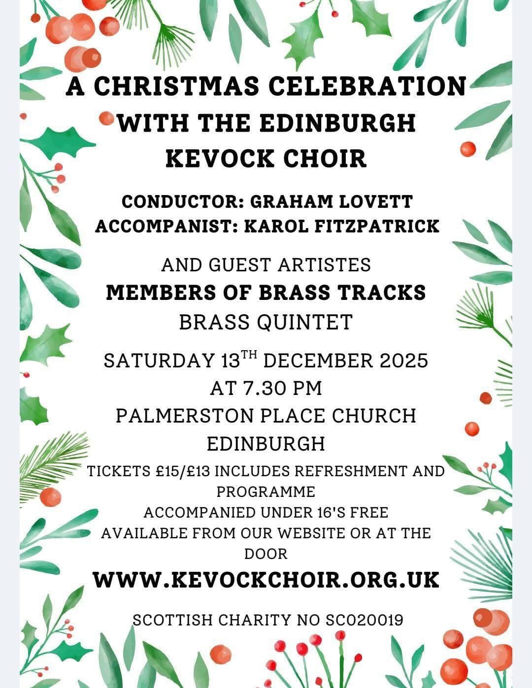 📌 “Saturday 13 December - Christmas Celebration with the Edinburgh Kevock Choir and special guests brass quintet, Members of Brass Tracks. Palmerston Place Church, 7.30pm. Tickets £15/13 (accompanied under-16s free): includes programme and interval refreshments.” - Thanks to Peter Nicholson, President, Edinburgh Kevock Choir for sharing this.