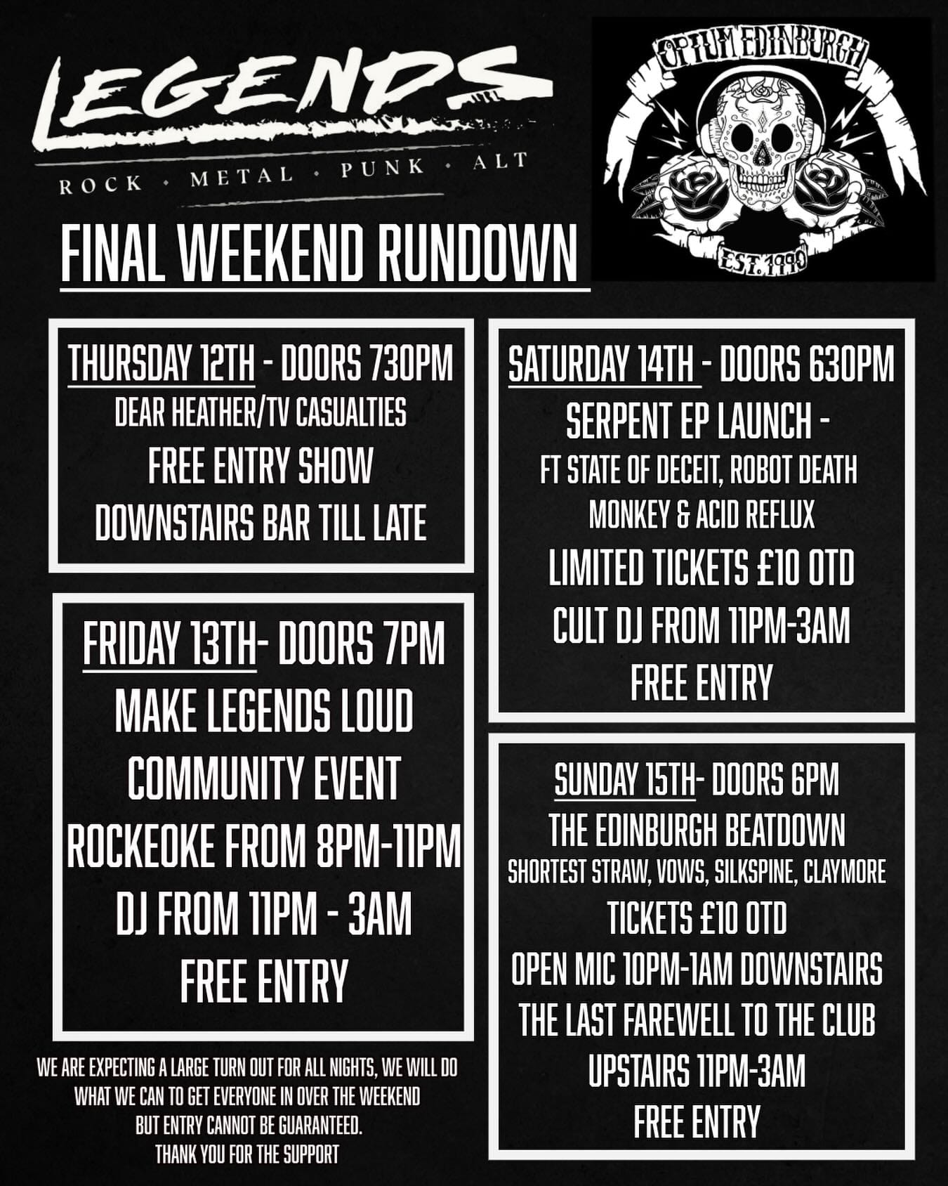 🎸 As reported first in the Minute earlier this week, this could be the last weekend of rock and metal at Legends in the Cowgate after more than 35 years. The club listings, described as a 'final week rundown' are here.