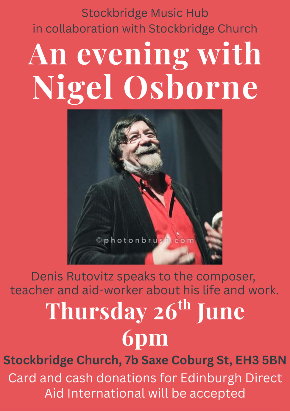 📌 "Come and hear about the remarkable, multi-lingual, visionary musician, scientist and aid worker, Nigel Osborne MBE. From prestigious orchestral premieres to life changing work with trauma affected children in conflict zones, he bridges artistry and activism. Prepare to be inspired and entertained at the Stockbridge Music Hub 6pm on Thursday 26th. All donations will go to Edinburgh Direct Aid." - Thanks to Clea Friend, Creative Director - Music Hub for sharing this.