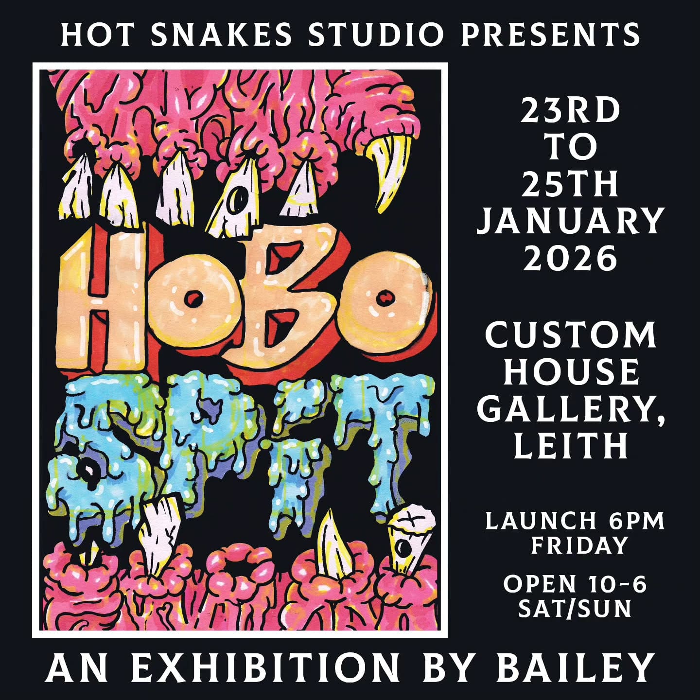 📌 "Friday 23 January - Hot Snakes Studio presents "Hobo Spit" An Exhibition by Bailey, a neon soup of GWARist retching and surrealist street art. First of our 2026 Mini Exhibitions at Custom House Gallery Leith (Launch 6pm Fri, Open 10-6pm Sat/Sun)." - Thanks to Robbie from Hot Snakes Studio for sharing this.