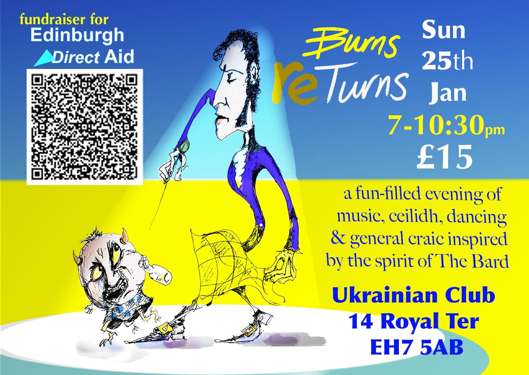 📌 "Sunday 25th January 7-10:30pm, Burns Returns: live music, dancing, turns & tunes celebrating all things bardic, in support of Edinburgh Direct Aid at the Ukrainian Club on Royal Terrace, kicking off with a foot-stomping ceilidh, be there or cry into your cranachan." - Thanks to conrad molleson, hoda productions, for sharing this.